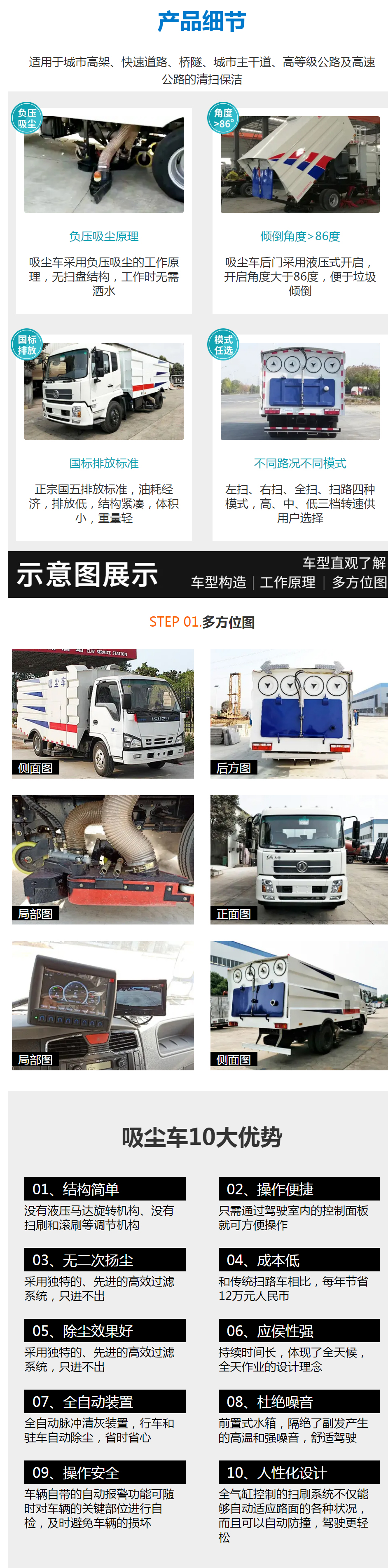 東風小多利卡5方吸塵車專用配置:塵箱:4立方米,水箱:1立方米;中置吸盤、江鈴五十鈴副發動機、施耐德控制開關、海普瑞斯電磁閥組、無級變速自動離合器、免維護離心式風機、高精度垃圾箱過濾系統(最高可達0.5微米),不銹鋼垃圾箱、進口脈沖閥、垃圾箱舉升自卸、尾部LED箭頭燈、車尾霧狀噴水潤濕功能、倒車影像、手動泵應急系統。