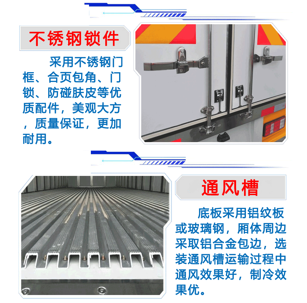 上裝配置:箱體采用內外玻璃鋼,中間8cm厚高密度保溫板,不銹鋼鎖件、門框、鉸鏈,鋁合金型材包邊、包角、陰角條,隔溫條,鋁花紋底板。